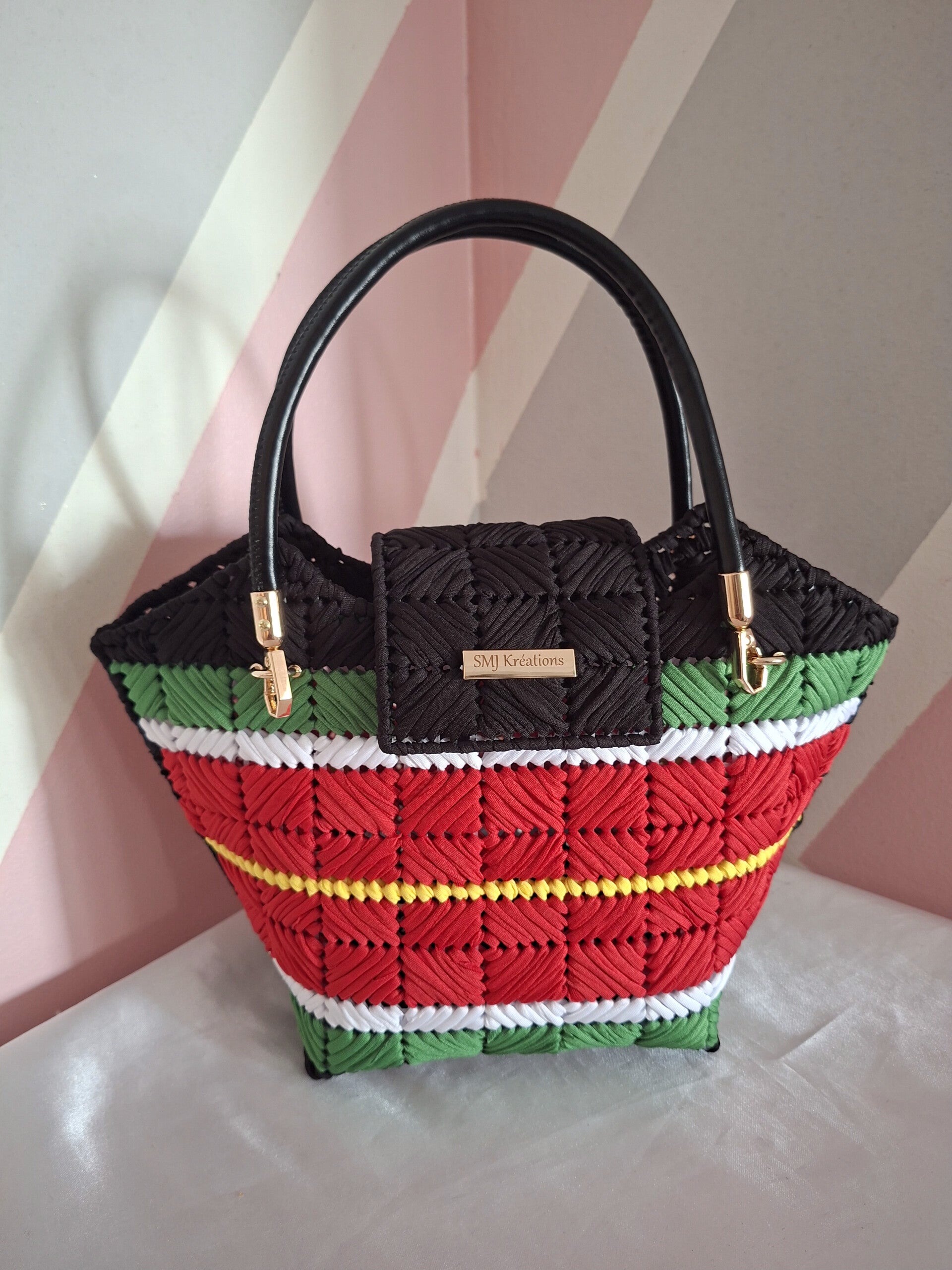 Affirmez votre style avec le sac MICHÈLE, une création artisanale signée SMJ Kréations. Entièrement tissé à la main, ce sac se distingue par son motif élégant et ses couleurs vibrantes qui apportent une touche de caractère à votre tenue. Sa poignée rigide et ses finitions dorées lui donnent une allure chic et raffinée, idéale pour sublimer vos looks au quotidien comme lors d’occasions spéciales.